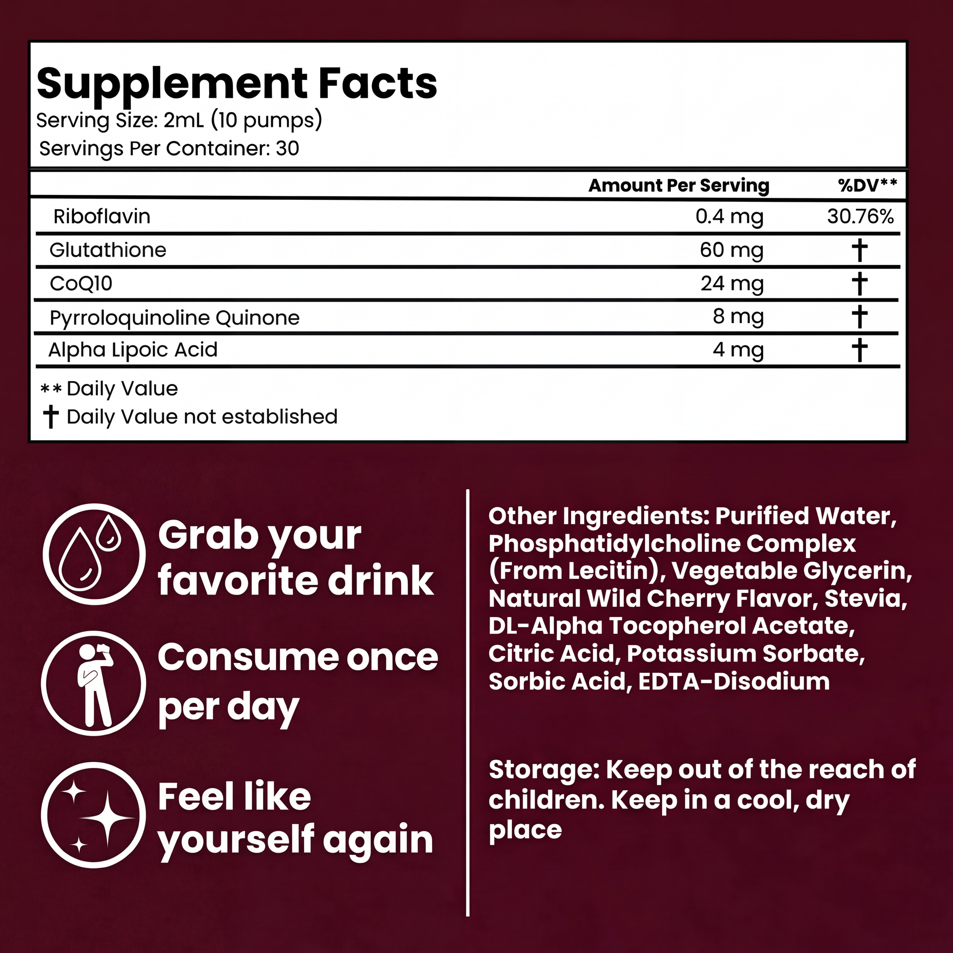 For best results: Take 10 pumps (2mL) daily, either directly under your tongue for maximum absorption or mixed into 8oz of cold water.