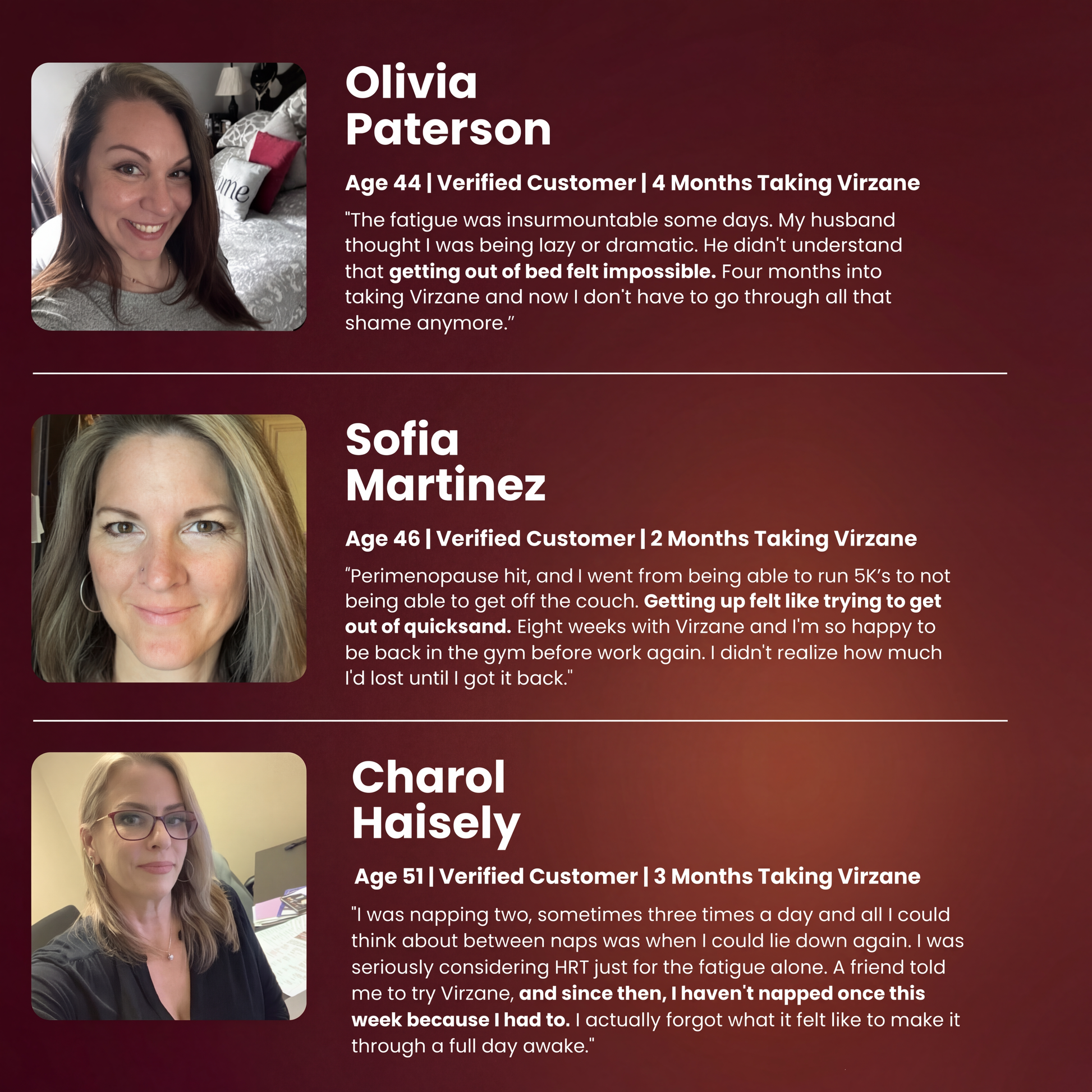 "I used to need three coffees just to make it to lunch — now I'm getting through my whole day without crashing at 2pm. My coworkers keep asking what changed. Four months with Virzane and I actually have energy left for my life after work!"